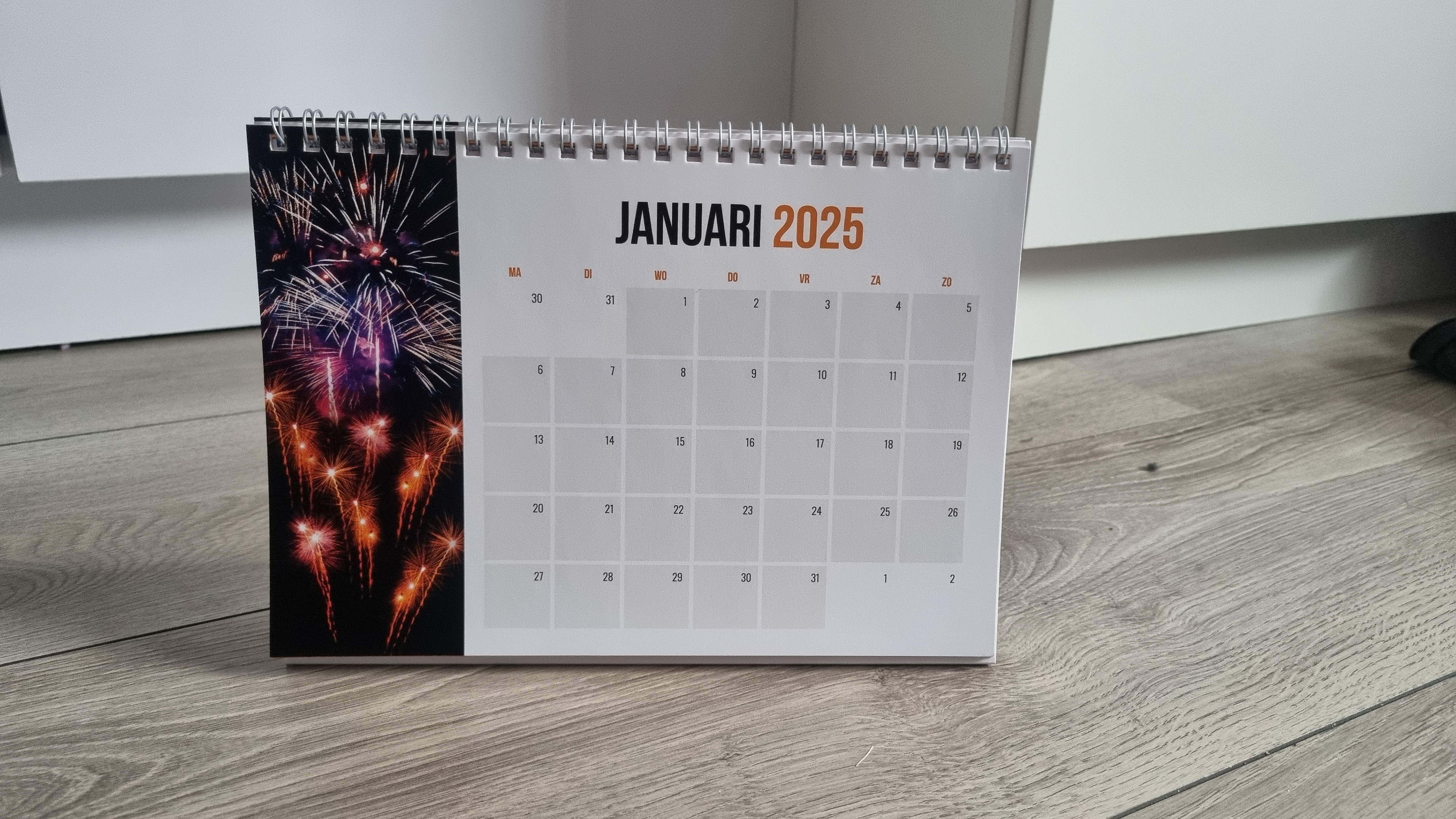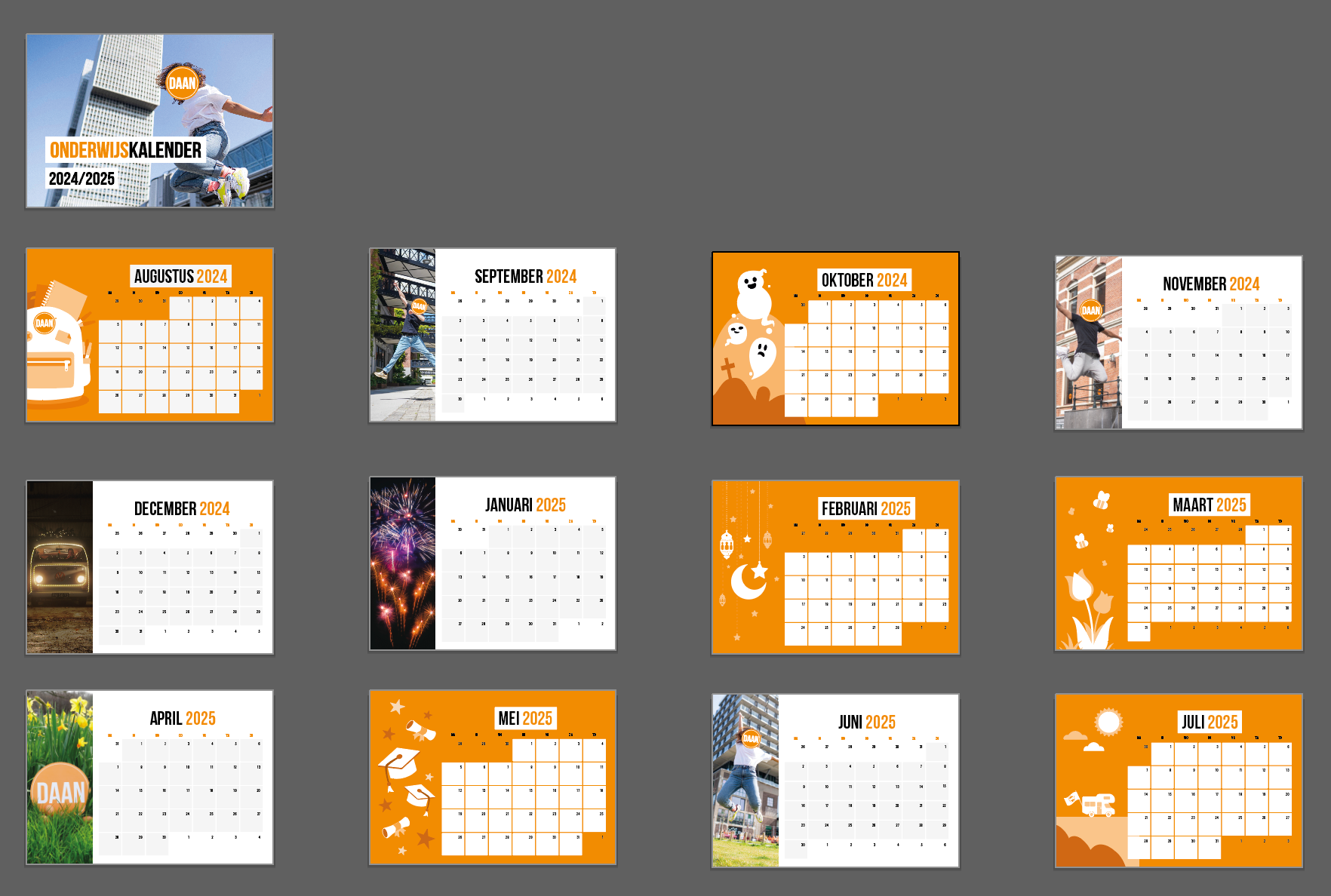 De kalender is ontworpen in Adobe Illustrator en bevat een illustratieve inhaker, thematische fotografie of huisstijlafbeeldingen op elke pagina. Na afronding van het ontwerp werd het bestand naar de drukker gestuurd en hebben we de fysieke exemplaren ontvangen. Het resultaat is een functionele én visueel aantrekkelijke kalender die volledig aansluit bij de branding van Daan.